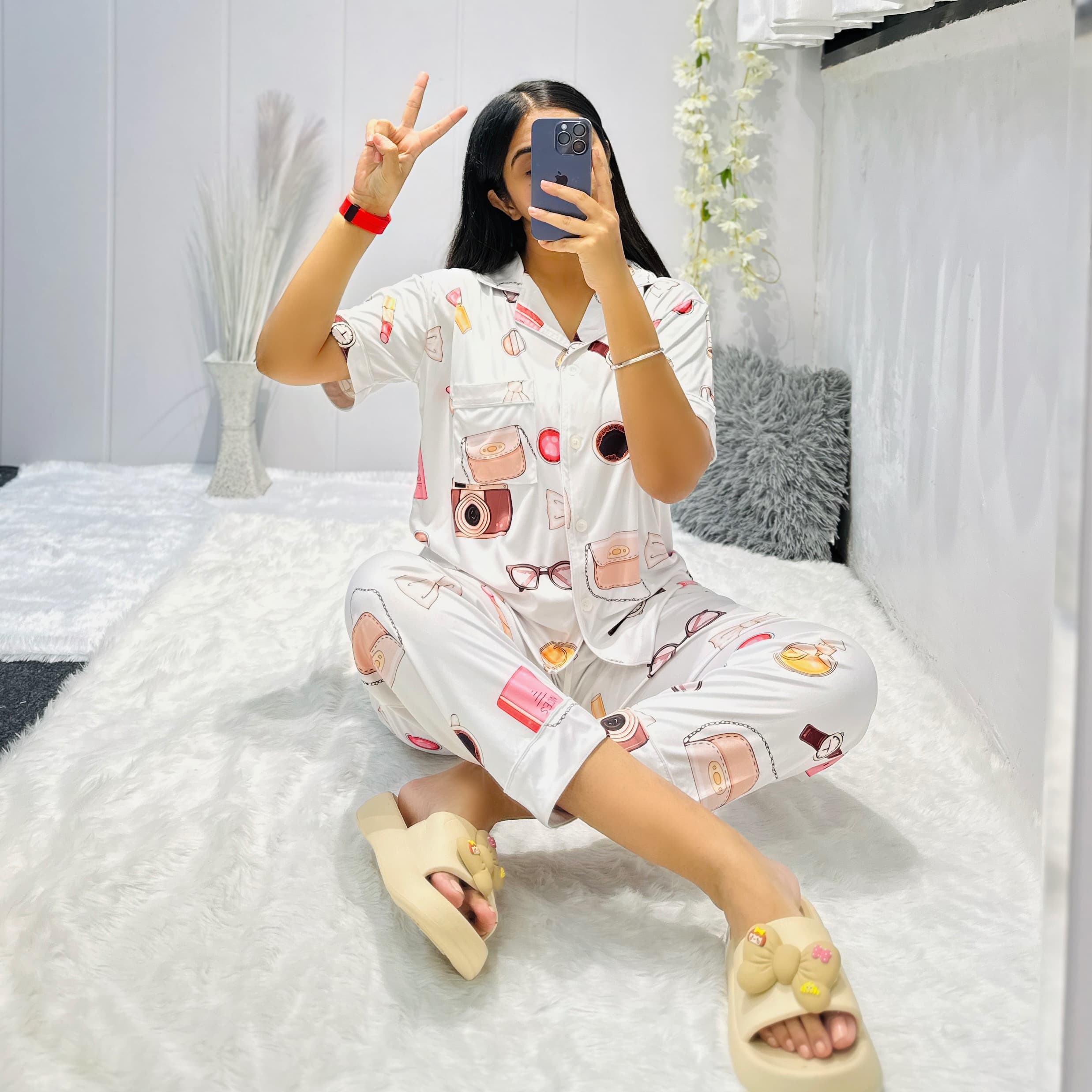 LADYSTUFF Printed piping night suit combo of shirt, pajama & shorts